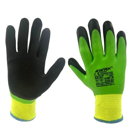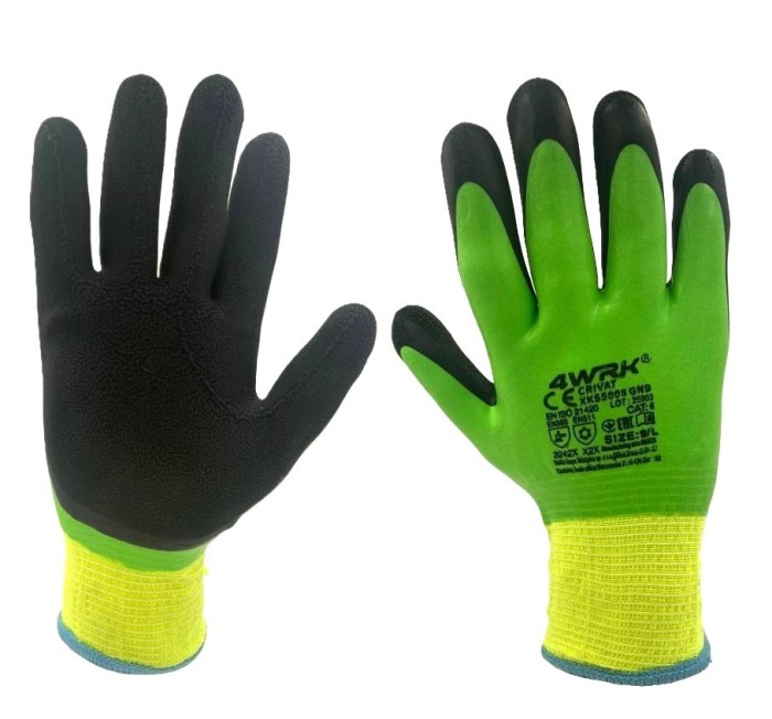 Charakterystyka: Skład [%]: dzinina poliestrowa, wyściółka frotte poliester, lateksowe pokrycie dłoni, dodatkowa podwójna warstwa lateksu porowatego. Masa pow. [g/m2]:92g/rękawica Normy: EN 21420, EN 388 (3,2,4,2,X), EN 511 (X2X) Pakowanie:12 par/opakowanie, 120 par/karton Kolory: żółta dzianina, zielono-czarne powleczenie Rozmiary:L-XL (9-10)