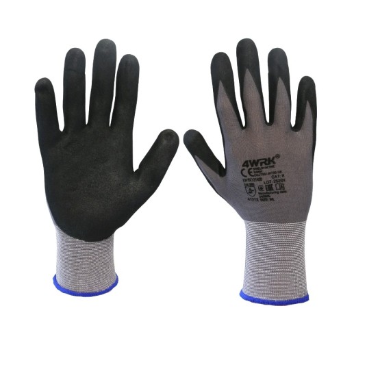 Skład [%]: Nylon, spandex, powłoka z mikropianki Masa pow. [g/m2]: 22g/rękawica Normy: EN 21420+A1, EN 388 (4,1,2,1,X) Pakowanie: 12 par/opakowanie, 240 par/karton Kolory: szara dzianina, czarne powleczenie Rozmiary: 8-11 (M-XXL)