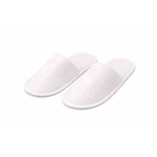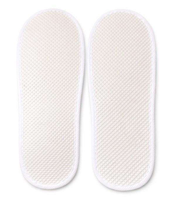 Białe kapcie z włókniny (non-woven), szyte z usztywnianą podeszwą z pianki EVA o grubości 3 mm. Zakryte palce zapewniają większy komfort i higienę, a uniwersalny rozmiar pasuje na większość stóp. Idealne do hoteli, SPA, salonów kosmetycznych i gabinetów medycznych.