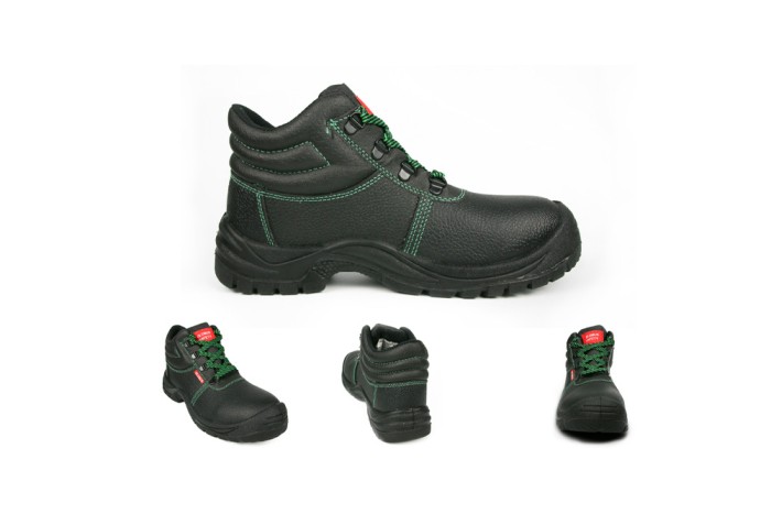 - skórzane trzewiki robocze- cholewka; czarna skóra tłoczona z czerwonymi przeszyciami, czarne metalowe D-ringi- czerwono-czarne sznurówki- wyściółka - tkanina Air-lining- antypoślizgowa podeszwa: wtrysk jednostopniowy PU- bez podnoska