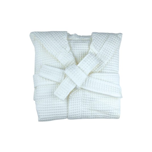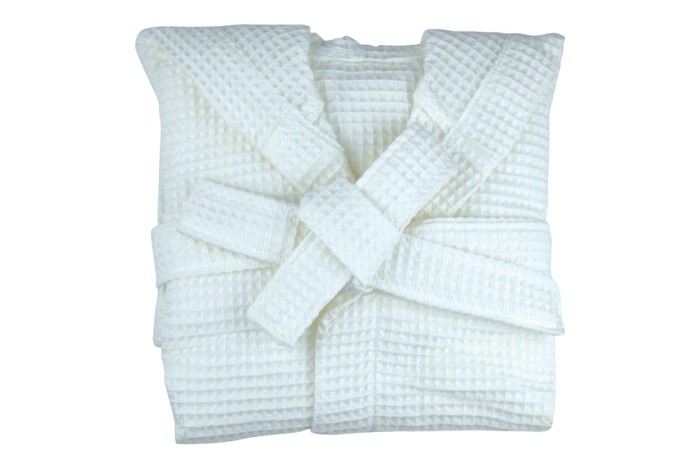Szlafrok KAI ma wyjątkowy waflowy design. Nie tylko prezentuje się w ciekawy sposób, ale również ma wiele cennych właściwości, które sprawdzają się w codziennym użytkowaniu. Prezentowany model w całości został uszyty z bawełnianej przędzy. Podczas użytkowania jest chłonny, skutecznie zbiera wodę ze skóry i szybko schnie. Gramatura 290 g/m² sprawia, że szlafrok jest lekki, ale bez utraty absorpcji.