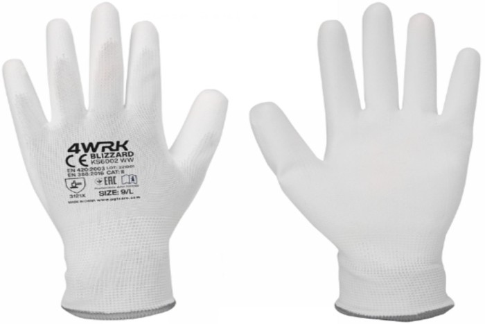 Rękawice poliestrowe w kolorze białym, powlekane warstwą białego poliuretanu. Rękawice znajdują zastosowanie przy pracach ogólnych i mechanicznych ze względu na wysoką odporność na ścieranie i rozdzieranie. Ponadto, wykazują dużą elastyczność, dopasowując się do kształtu dłoni.