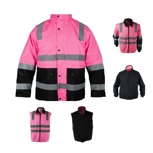 Charakterystyka: Skład [%]: 300D Oxford z powłoką PU, podszewka z siatki / poliestru / taffeta na kurtkę zewnętrzną / podszewka pikowana / podszewka z polaru na kurtkę wewnętrzną Pakowanie: 8 sztuk w kartonie Kolory: Różowo - czarny Rozmiary: XS, S, M